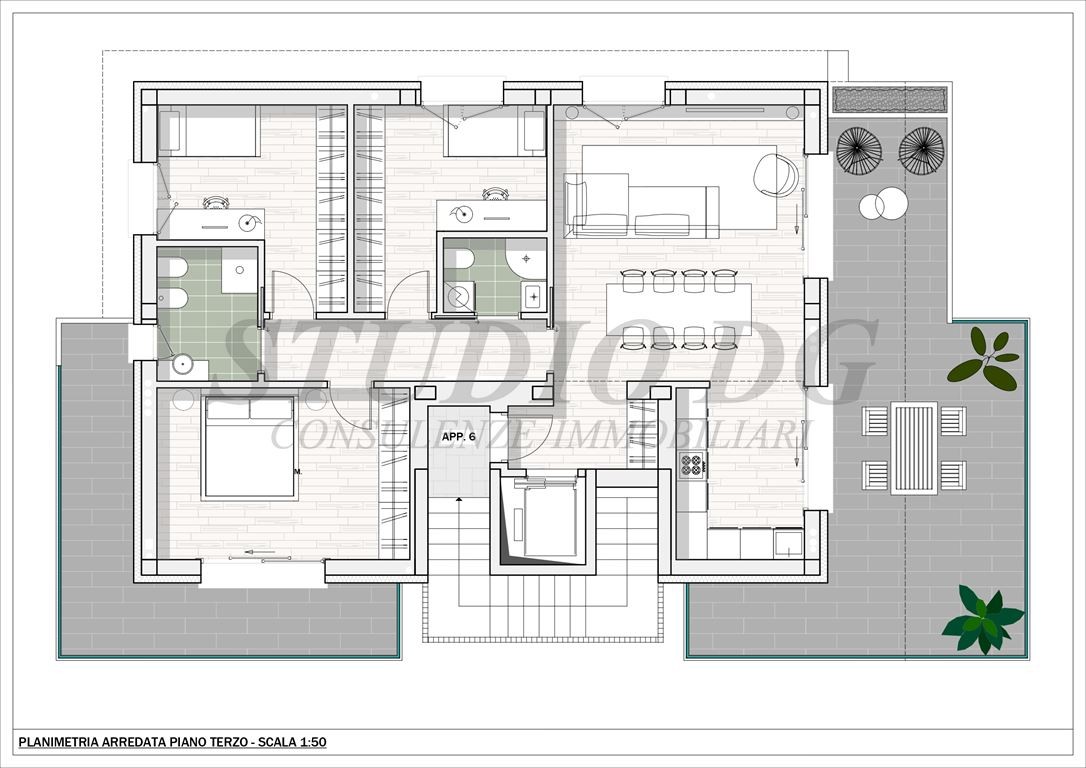La palazzina di sole sei unità abitative sorge in posizione privilegiata e dispone di appartamenti dotati di giardini privati e ampi terrazzi.